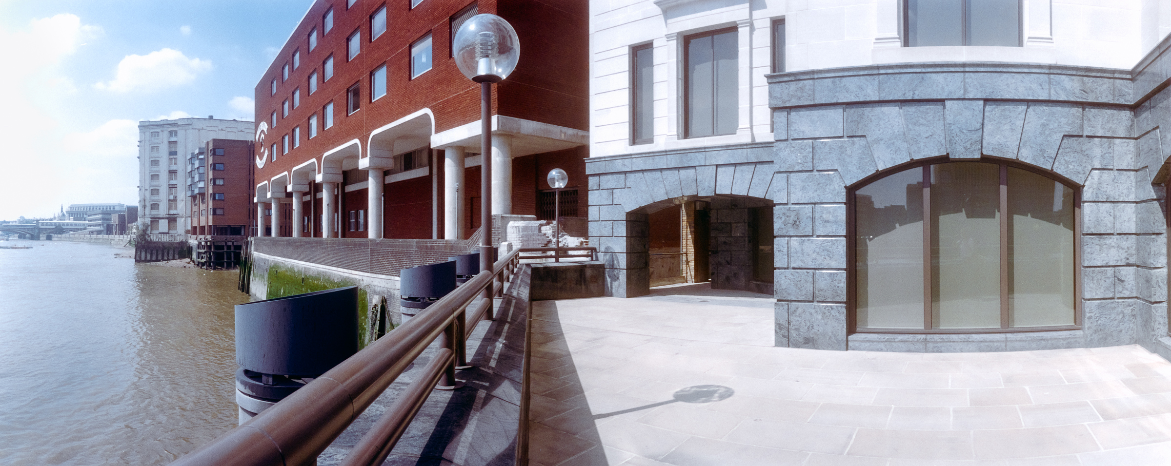 Looking west along the river to Bull Wharf, Queenhithe and beyond. Bull Wharf proudly states it was REBUILT 1980 and it looks to me exceedingly ugly, probably why I didn’t upload this picture to Flickr. My picture perhaps makes the red brickwork event more virulent – the building looks much better to me in a black and white non-panoramic image I made at the same time from more or less the same spot.