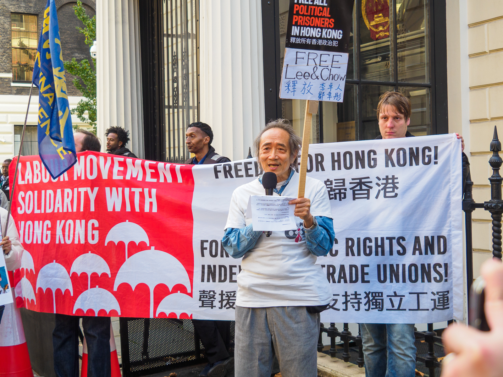 Trade unionists protested outside the Chinese Embassy in solidarity with the three Hong Kong pro-democracy leaders charged with inciting subversion under Beijing’s National Security Law for organising protests and vigils whose trial begins on 11 Nov.