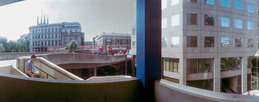 Another exposure from the highwalk at Wood Street, leading south along the east side of the street away from London Wall. In the centre of the picture is the City of London Police Headquarters, with two white police vans at bottom right. Steps lead down from the walkway to Wood Street but the highwalk also continued straight on at extreme left – though with more steps.