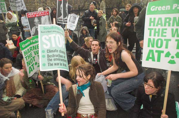 The Campaign Against Climate Change was one of the first organisations in the UK to serilsly begin organising against global warming – and I remember photographing them back in 2002 pushing an attractive ‘Tiger’ on a bed from the Esso headquarters in Leatherhead to the US Embassy in Grosvenor Square, Westminster. US President George W Bush had put the interests of climate-denying US Oil and fossil fuel companies, notably Esso, above the survival of our species with with his rejection of the Kyoto protocol, agreed in 1997 but only due to come into force in 2005.