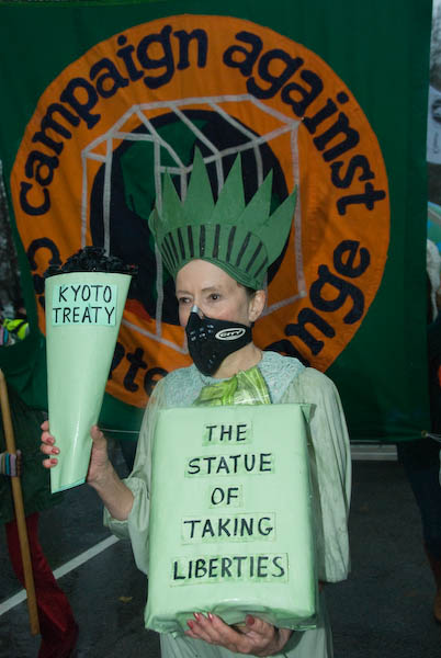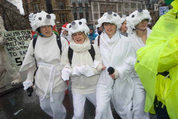 It was a lousy day, with strong winds and intermittent heavy showers, but that didn’t stop more than 6000 marchers turning out for the event, many in fancy dress as santas, polar bears, reindeer, elves, penguins and more to highlight the problem of melting polar icecaps. At the front of the march was the ‘Statue of Taking Liberties’ with the Kyoto treaty, followed by the Earth in its greenhouse as in the Campaign against Climate Change logo. And Lucy, our favourite mermaid was there to remind us of the perils of rising sea levels.