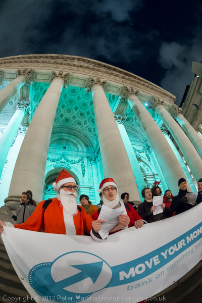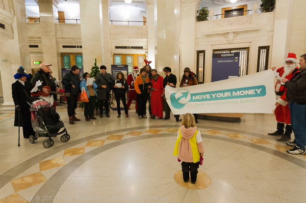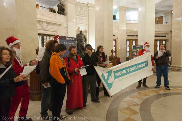 The group moved cross the street to the RBS, reminding them the government supported the banks with an unimaginable £1.162 trillion. The several carols there, included: