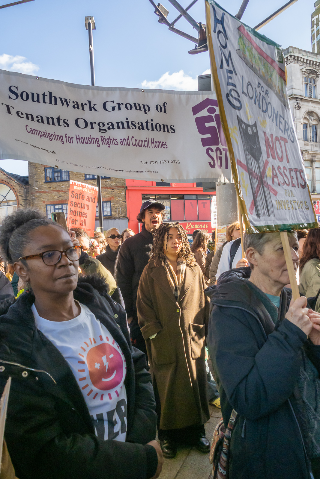 London, UK. 1 March 2025. Over 600 Southwark residents march from a rally in Peckham to Borough, outraged against plans by Berkeley Homes at the Aylesham Centre for only 12% of affordable housing – while Southwark has around 18,000 families on the council waiting list. London desperately needs more housing at social rents, not high market price housing for developer’s profits. More joined the march at Burgess Park. Peter Marshall.