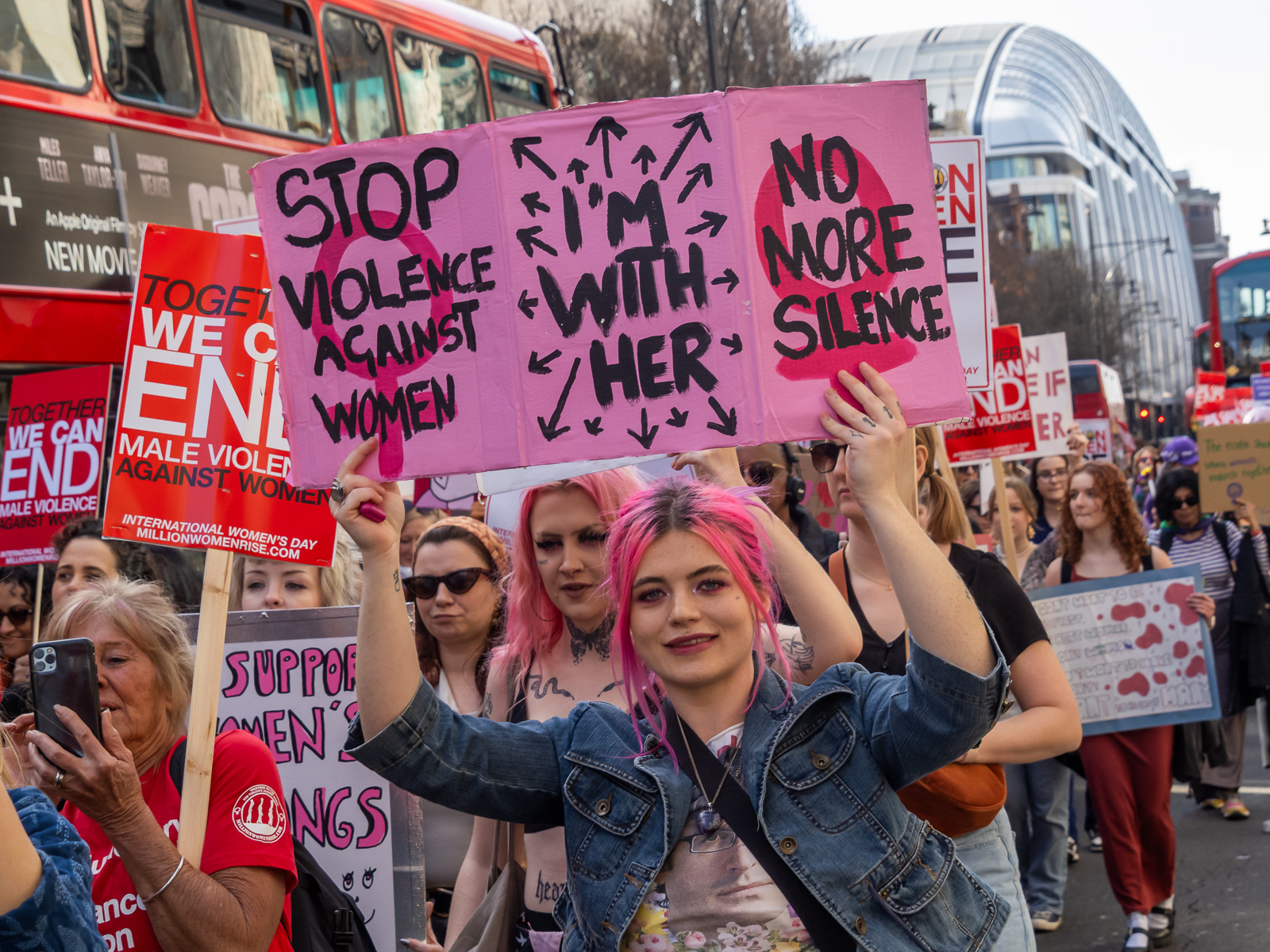 London, UK. 8 Mar 2025. Women, including many from migrant groups, marched along Oxford Street and on to a rally in Trafalgar Square for Million Women Rise, a woman-only march on International Women’s Day. Men supporters were only allowed on the pavement. The march called for an end to male violence against women and girls in all its forms and to everyday and structural racism at the heart of policing and our immigration system and society generally. Peter Marshall