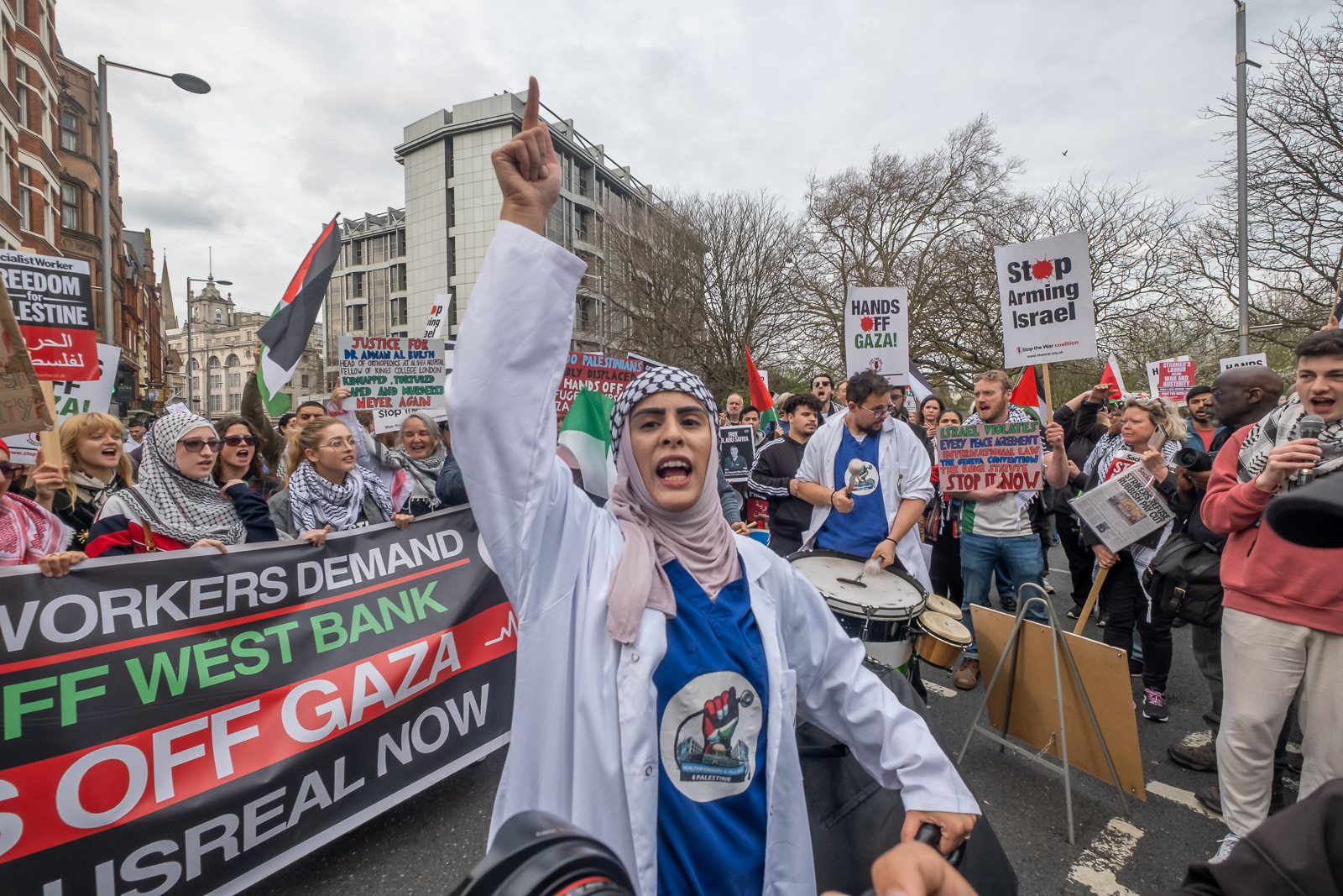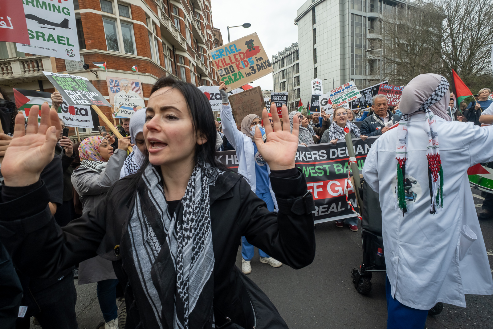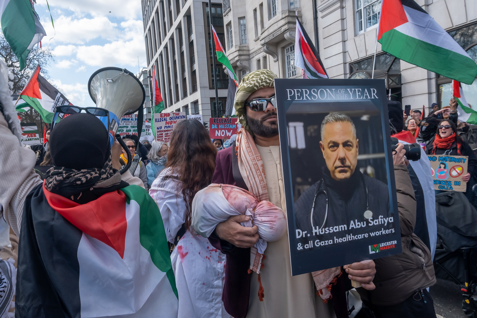 London, UK. 15 March 2025. Dr Hussam Abu Safiya & all Gaza healthcare workers. Many thousands including large numbers of Jews marched from Green Park to Whitehall days after Israel had blocked off all supplies of goods and electricity to Gaza in clearly genocidal acts violating international humanitarian laws and in breach of the ceasefire agreement they had made earlier. Protesters called for a permanent ceasefire now and for negotiations to lead to freedom for Palestine and to bring peace to the area. A small group waved Israeli flags, shouted abuse and made obscene gestures as they passed. Peter Marshall