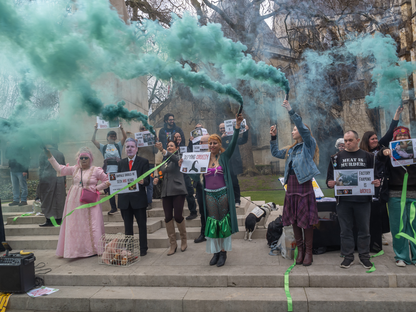 London, UK. 22 March 2025. A peaceful and colourful street theatre demo by Scrap Factory Farming opposite Parliament called on the Labour government to start an immediate phase out of Factory Farming. They say it is wicked and inflicts great cruelty on animals we should work towards a world that is kinder to animals, people and planet. Peter Marshall