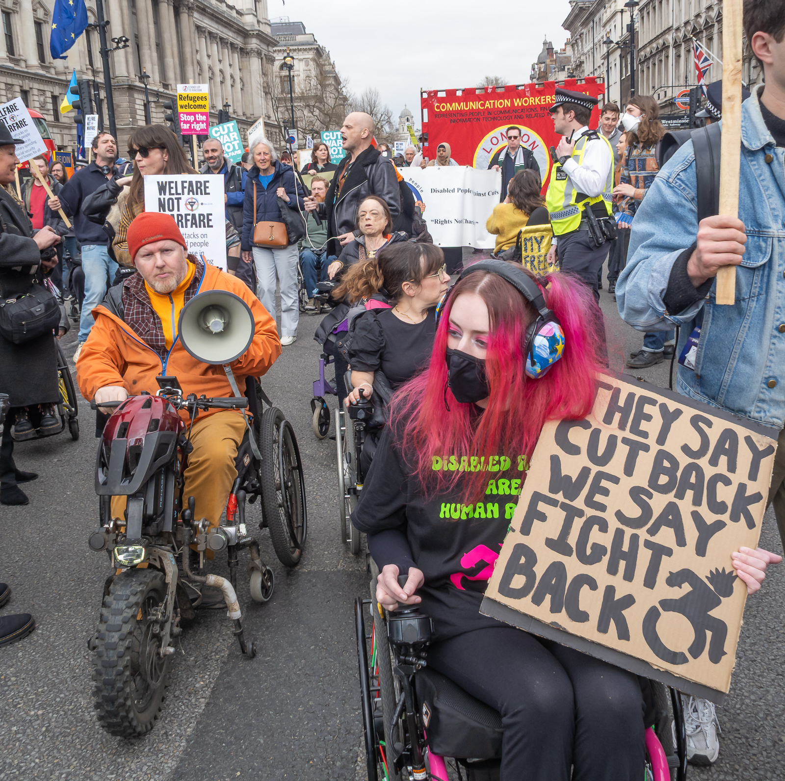 London, UK. 26 Mar 2025. After protesting at Downing St disabled people and supporters marched to protest outside parliament against cuts in incapacity benefits and removing PIP payments from a million people. Some will lose as much as £10,000 a year as they will also lose carer’s allowance and their ability to contribute to society. Many will die from the cuts and they say there are simple ways to make the savings in a largely progressive way rather than severely punishing the disabled. Peter Marshall