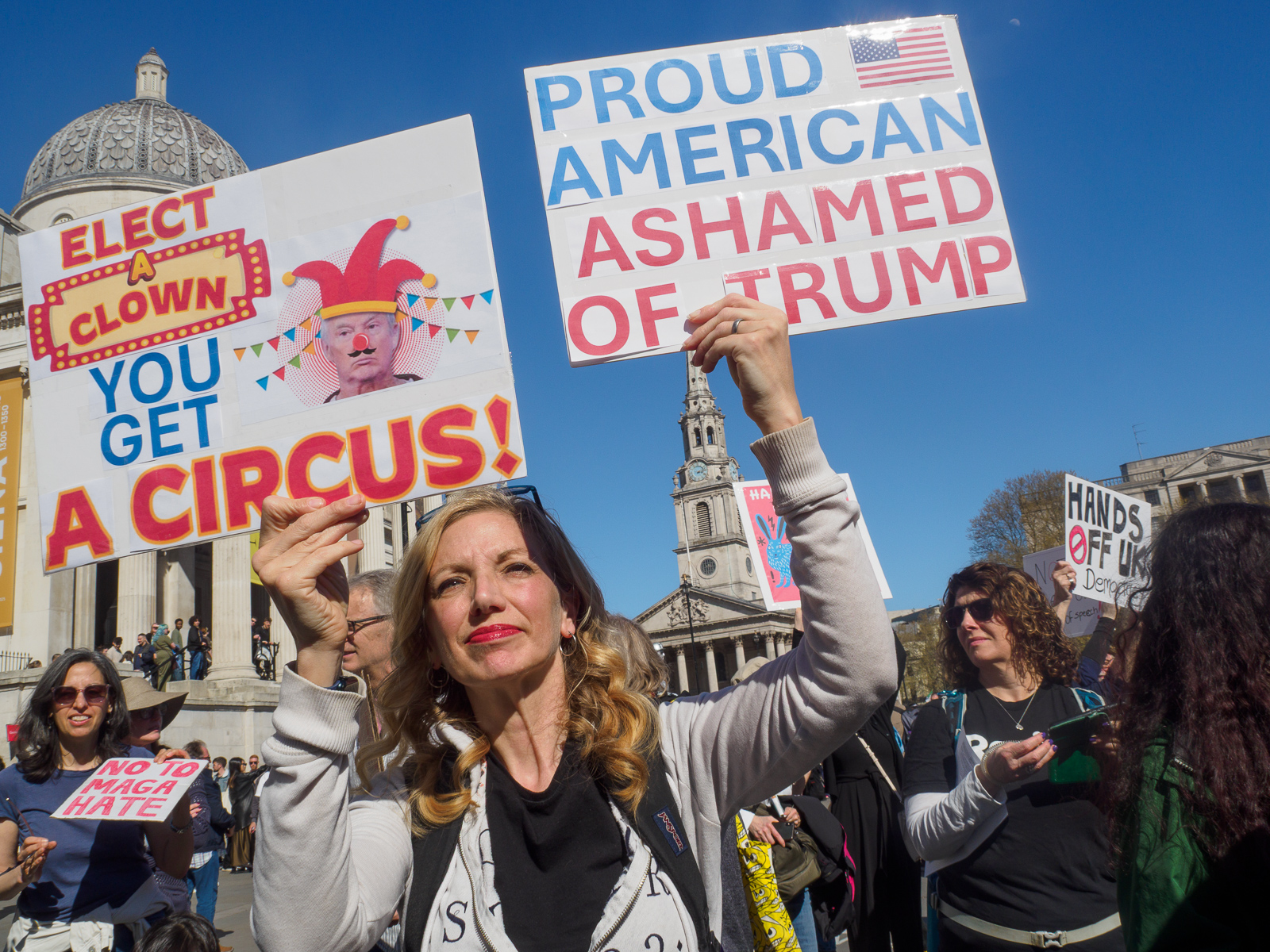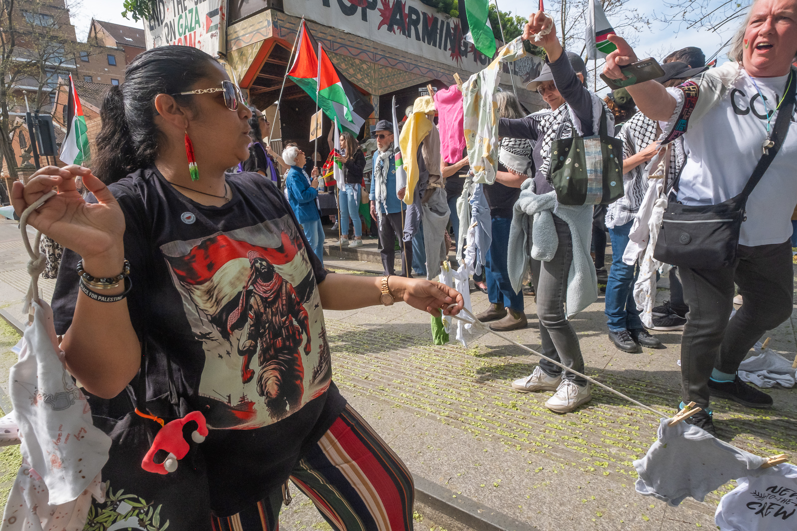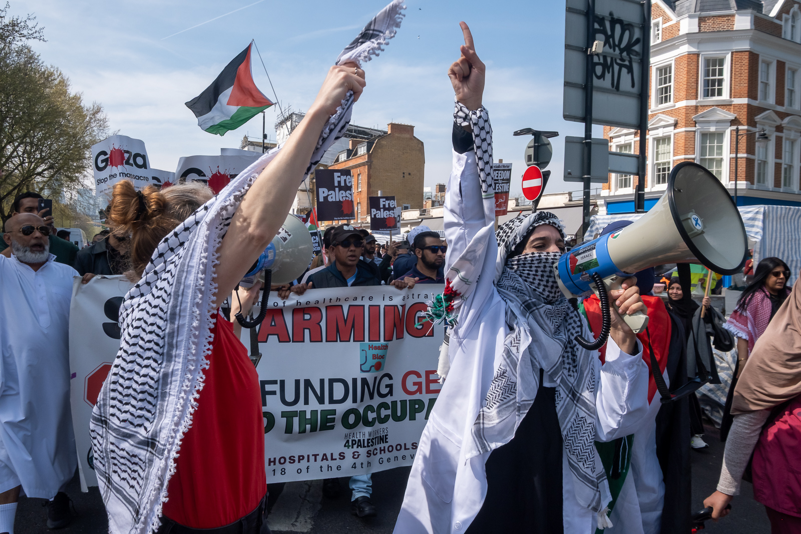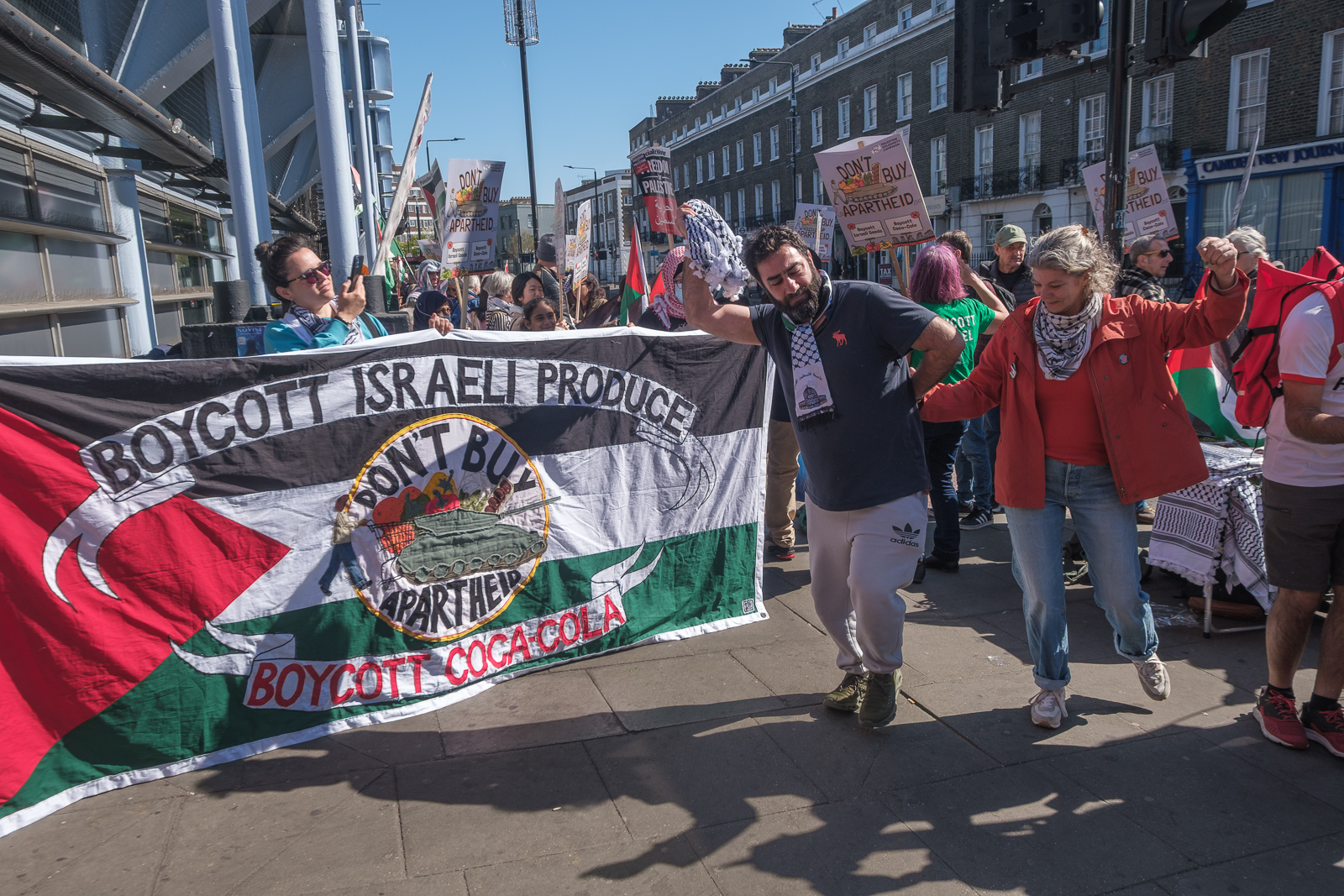 London, UK. 5 April 2025. The first UK-wide Don’t Buy Apartheid day of action began with a protest outside Sainsbury’s Camden with protesters demanding that Israeli produce and Coca-Cola be removed from the shelves, and asking individual shoppers to join the boycott. Israeli fresh produce is grown in illegal Israeli settlements on stolen Palestinian land and Coca-Cola has a distribution centre for its brands in an illegal settlement in Jerusalem. Peter MarshallLondon, UK. 5 April 2025. A rally in Trafalgar Square joins in the mass mobilisation day of over 1300 protests across the USA by the non-violent Hands Off! campaign. Furious Americans protest against the chaos and lurch towards fascism of the Trump administration with its import tariffs, lunatic proposals on Ukraine and Gaza, threats to invade Canada, Panama and Greenland, gutting public services. Their illegal power grab is destroying democracy for the benefit of their billionaire allies. Peter MarshallLondon, UK. 12 April 2025. Londoners march through the East End from Altab Ali Park in a national day of actions to demand our government immediately stop arming Israel and demand Israel end its genocide which has already killed at least 50,000 Palestinians and displaced more than 90% of Gaza’s population multiple times. They were joined at Bethnal Green by others who had marched from Hackney. Peter Marshall.London, UK. 12 April 2025. A washing line of childrens clothes for the many children killed., A two hour Circle for Palestine vigil around the US Embassy opposite The Surge London Community Camp in Nine Elms showed solidarity with Palestinians and called out the complicity of the USA in the ongoing genocide in Gaza which has already killed at least 50,000 Palestinians and displaced more than 90% of Gaza’s population multiple times. They hold banners in a two hour vigil around the Embassy building. Peter MarshallLondon, UK. 19 April 2025. Many thousands fill Parliament Square for a rally and march through Westminster after the Supreme Court ruling that ‘sex’ in the 2010 Equality Act means biological sex and that the legal definition of a woman excludes trans women. Although the judgement also stressed the importance of t2010 Equality Act London, UK. 26 April 2025. Luke Watson photo, Hundreds of Just Stop Oil supporters came to St James Park for a final march to celebrate the success of their civil resistance and to protest the draconian sentences being served by many of those involved in their peaceful protests, with others still awaiting trial. They marched around Parliament Square, many holding photographs of the ‘political prisoners’ before marching to a rally at the law courts. Peter MarshallLondon, UK. 26 April 2025. Hundreds of farmers, growers, foresters and land-based workers in The Landworkers’ Alliance march behind a tractor from a rally in Vauxhall to the Home Office to call for systemic change in our food system. They want a legal right to nutritous ecologically produced food for all and a national strategy to prioritise healthy food production and give fair incomes for land workers, including seasonal migrant workers who currently are illegally exploited. Peter Marshall
