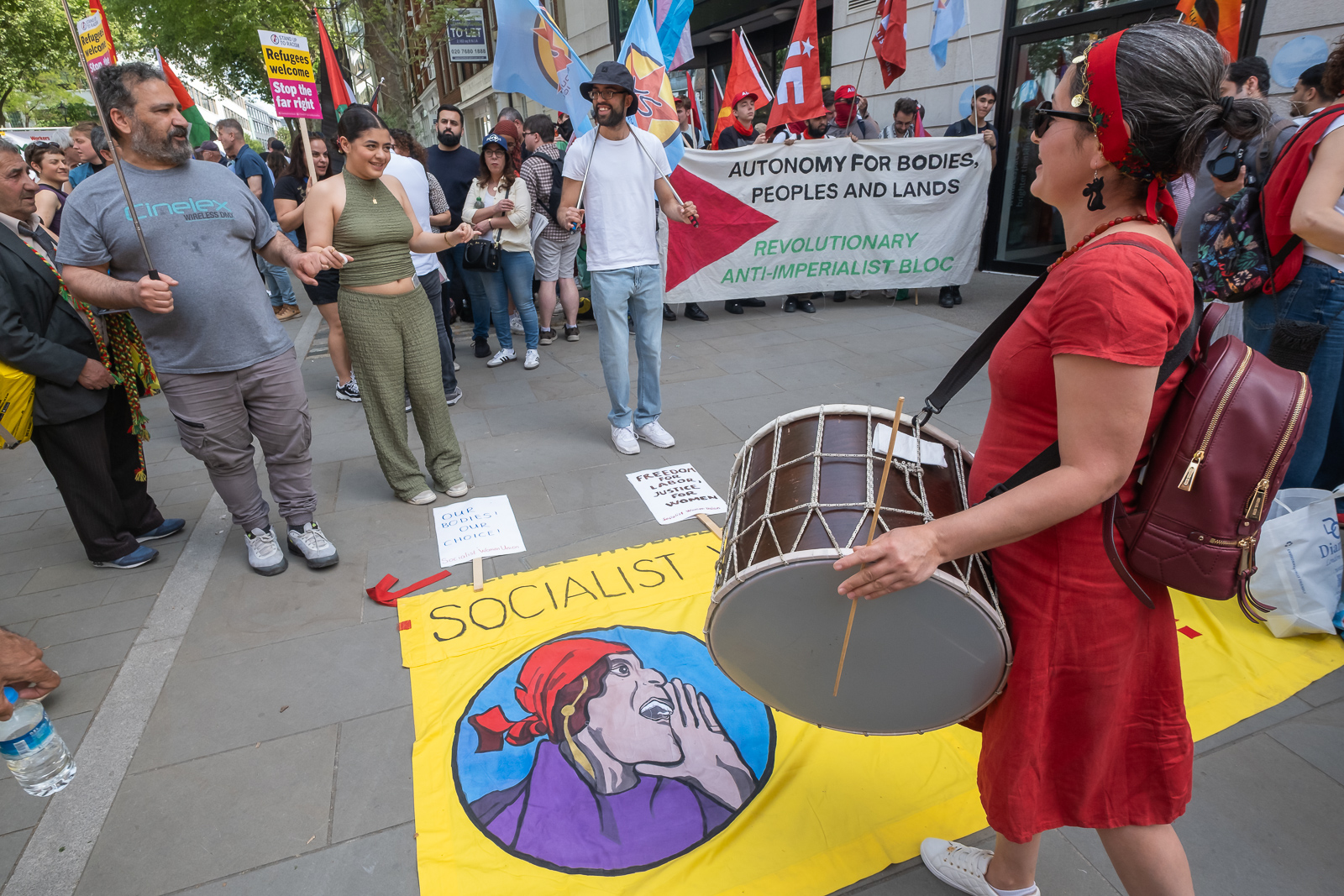 London, UK. 1 May 2025. Socialist Women’s Union. Several thousands met at Clerkenwell Green on May Day before the International Workers Day March to Trafalgar Square. Those taking part included many from London’s various ethnic communities – Turkish, Kurdish, Latin American, West Indian, Indian, Sri Lankan, Tamil, Iraqi, Iranian and more as well as many from UK trade unions, communist and anarchist groups. Many showed their support for Palestine and other international issues. Peter Marshall