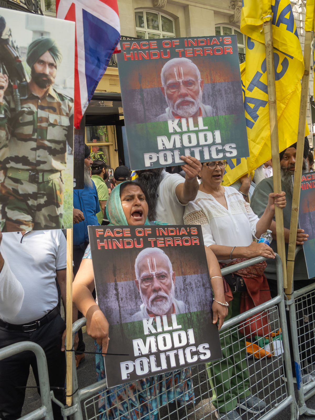London, UK, 1 May 2025. Sikhs and other supporters of Kashmir protest opposite the Indian High Commission against Modi and his Hindu nationalist government following his threats to Pakistan, suspension of the water-sharing agreement and reprisals against Kashmiris after the 22 April attack which killed 28 tourists. India has implemented a brutal military occupation of areas of Kashmir since they were controversially linked to India at partition in 1947. A smaller protest by the embassy supported Modi. Peter Marshall