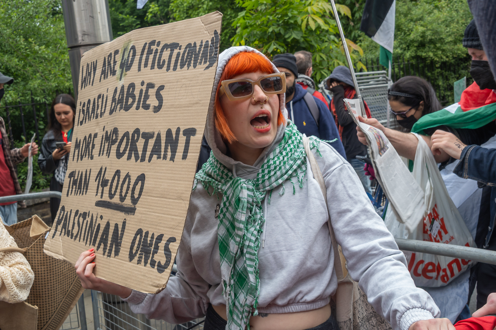 London, UK. 24 May 2025. Police forced the protest by ‘Fight Racism, Fight Imperialism’ into a pen 150m from the Israeli Embassy. They demand an end to the Israeli siege of Gaza to save the 14,000 babies who will die unless Israel complies with international law and stops its starvation of the people of Gaza and that the UK cuts all military, financial, diplomatic, and cultural ties with the Zionist state. Peter Marshall.