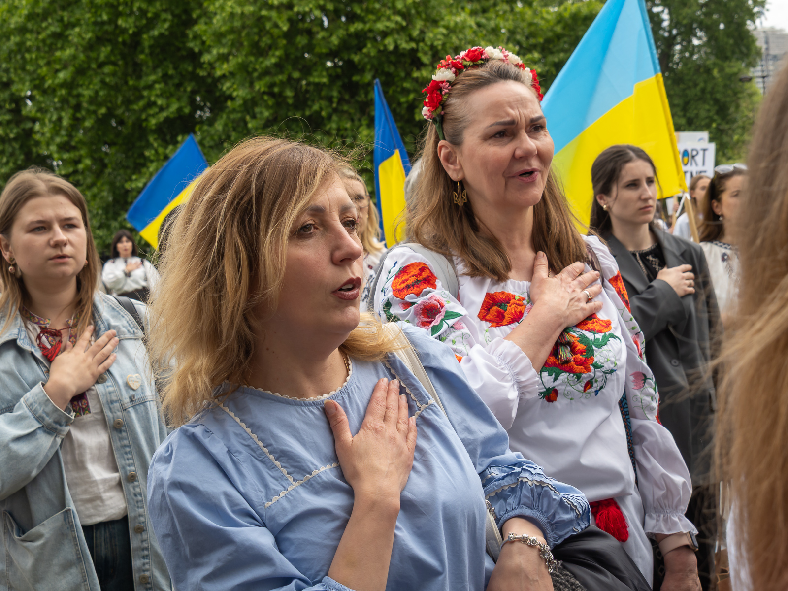 London, UK, 24 May 2025. Singing their national anthem. Around 2000 Ukrainians, many wearing traditional Vyshyvanka embroidery and women and girls with floral headdresses met for an opening ceremony at Marble Arch with speeches, prayers and performances mainly by children. They called for justice and an end to the Russian invasion and for Ukraine’s stolen children to be brought home. Children then led the procession to the St Volodymyr Monument at Holland Park. Peter Marshall.