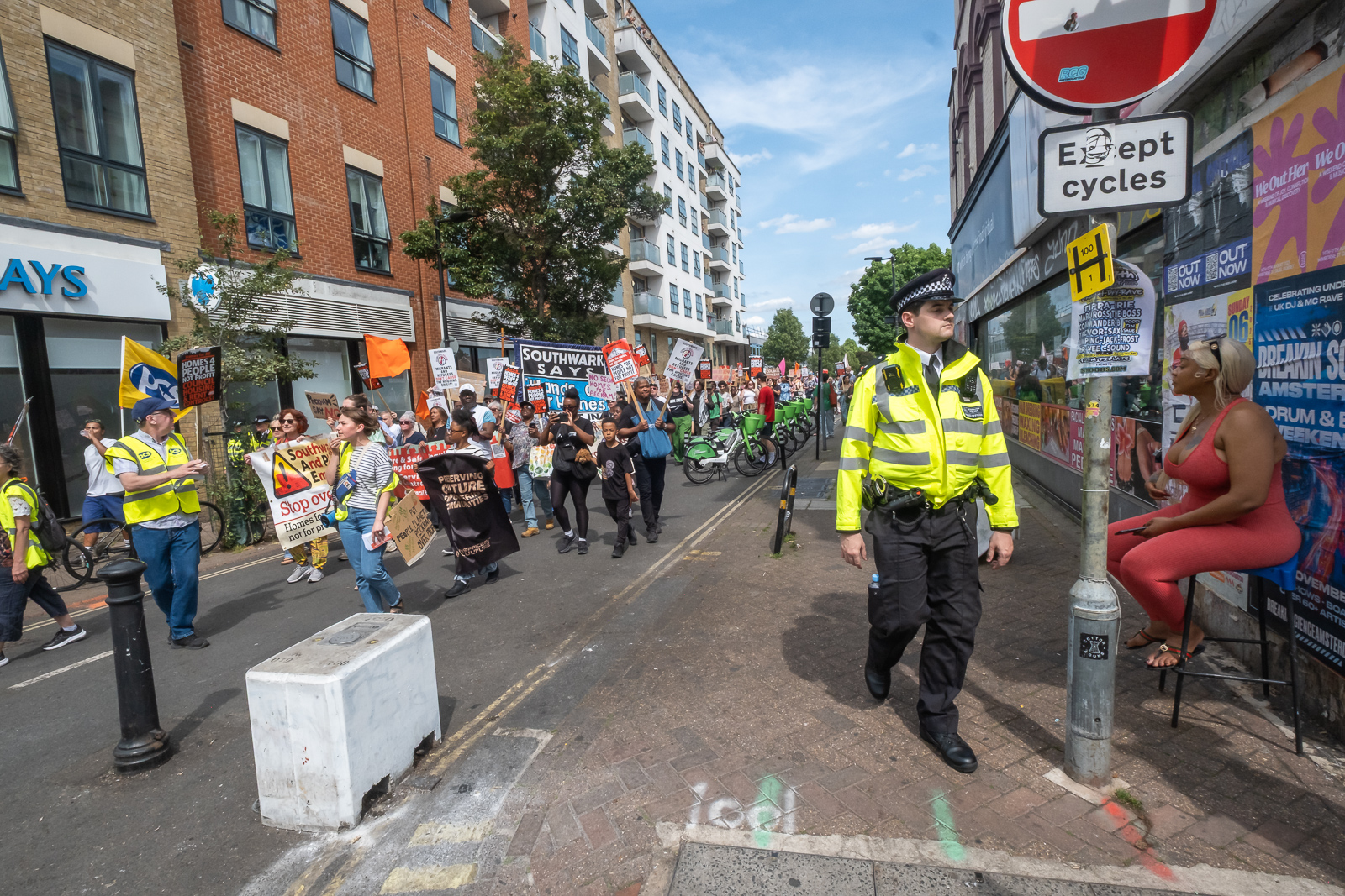 London, UK. 31 May 2005. A rally and march around the centre of Peckham organised by SHAPE (Southwark Housing And Planning Emergency) called for the redevelopment of the Aylesham Centre to provide social housing desperately needed for the people of Peckham rather than unaffordable luxury flats for rich investors, with just the token 12% developers Barkeley homes propose, as well as offering a future for the current local traders in the market there. Peter Marshall.