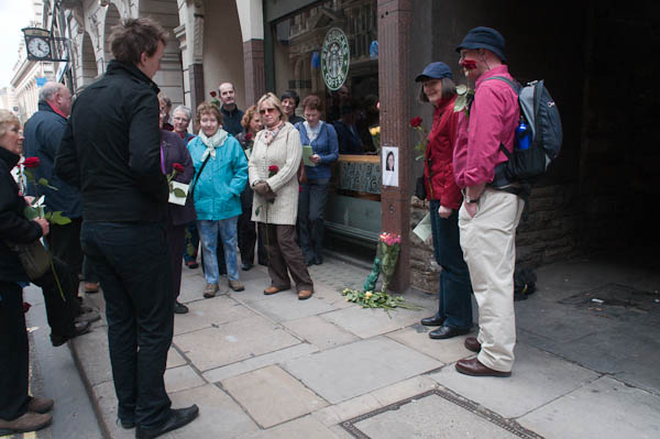 I was standing there when to my surprise a group of around 20 people, each holding a red flower came towards me, led by a woman with a badge saying ‘Steward.’ They stopped for a short performance exactly where Tomlinson died, where there was a picture of a woman and some flowers
