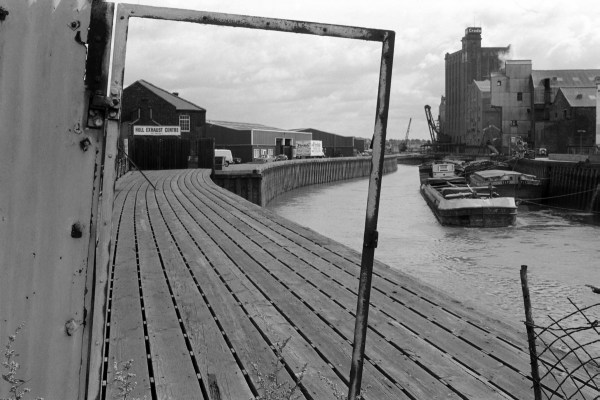 32r25: Pipe bridge, Bankside and Reckitt’s Chimney, Morland St, 1982 – River Hull