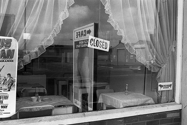 One of my favourite images from Hull, with its lively lettering and rather erratics letter heights in the sign-writing, the vase of daffs, one with a broken stem, and the patterning of the net curtain, the step and the frontage as a whole, which together I find rather satisfying. It was probably taken on a Sunday as there is a closed sign on the door.