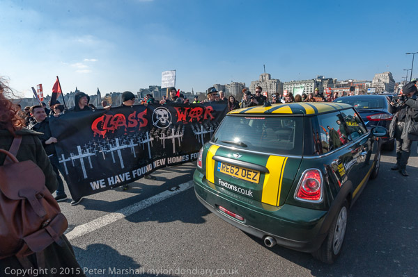 And hard too not to rant about housing as you can see. Unless that is you are ignorant about what is happening or too busy stuffing the loot into your offshore bank accounts. It’s an area which is class war at its most naked – and where the poor have been losing badly. And one which Class War, who appear in rather a lot of my pictures, have been one of the more active groups in protesting about and bringing on to the public agenda.