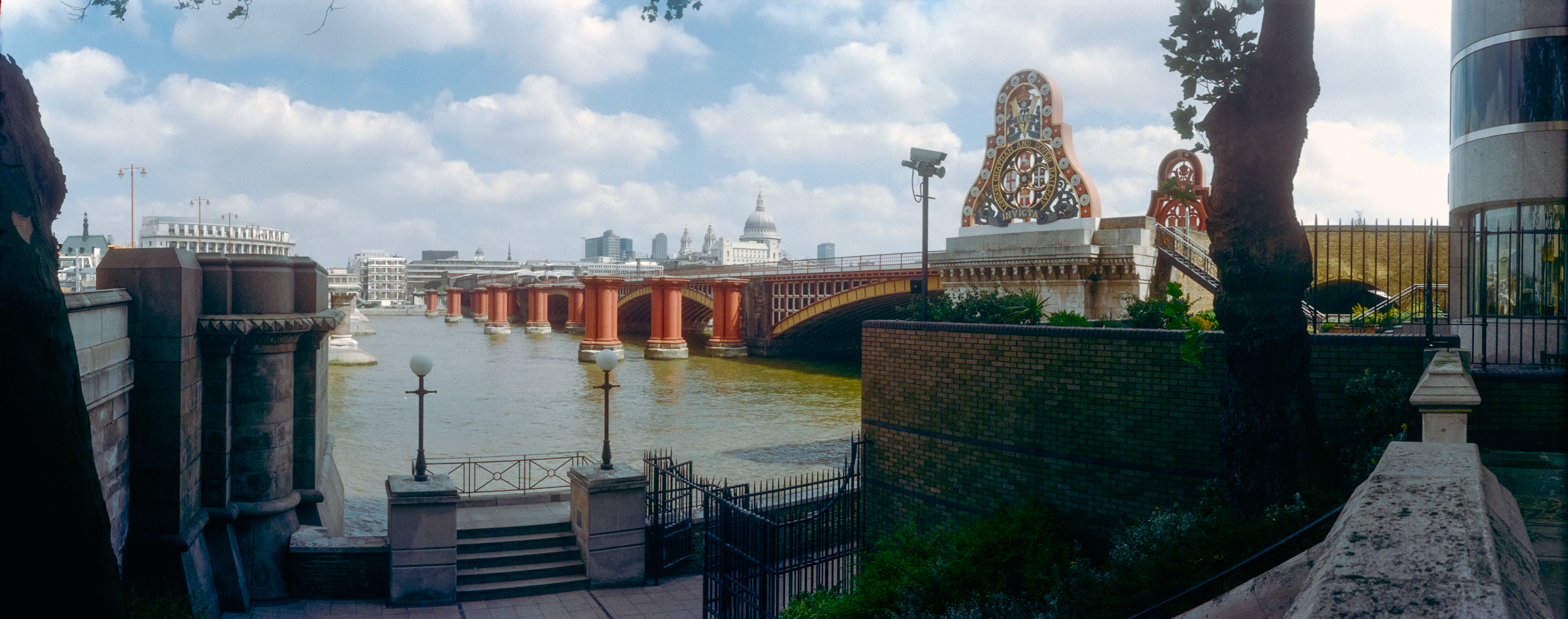 Early in July I took a train to Waterloo and walked into the City from there, pausing before I crossed Blackfriars Bridge to make this panorama. This is the only place where the City comes ‘South of the River’ and where I was standing in Rennie Garden I was already in the City of London, though the wall at right and half the rail bridge past it is in Southwark.